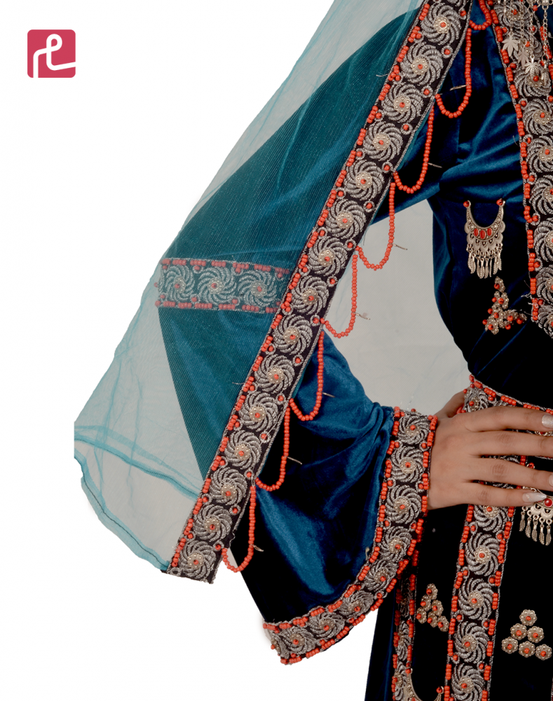 استمتعي بجمال الزي الصنعاني مع هذا الزي الفريد المرصع بالمرجان وهلالات فضية بحياكة اليد, لون مميز أضيفي لمسة راقية على إطلالتك.