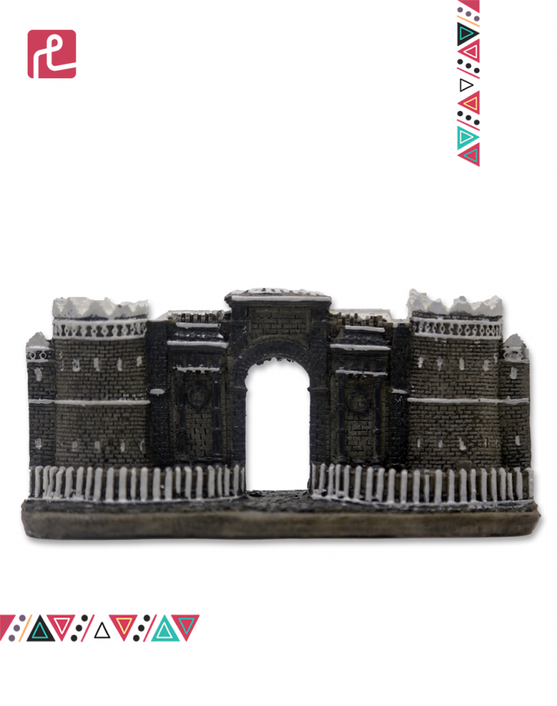 تحفة فنية تصور بوابة باب اليمن التقليدية مع نوبات الحراسة، مصنوعة بدقة واحترافية ، تعكس رونق وأهمية العمارة اليمنية التاريخية.