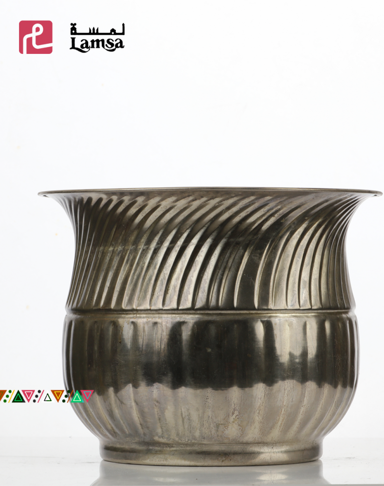 فازة "مزهرية" من المعدن الابيض مزينة على الجوانب بخطوط مشغولة يدويا.