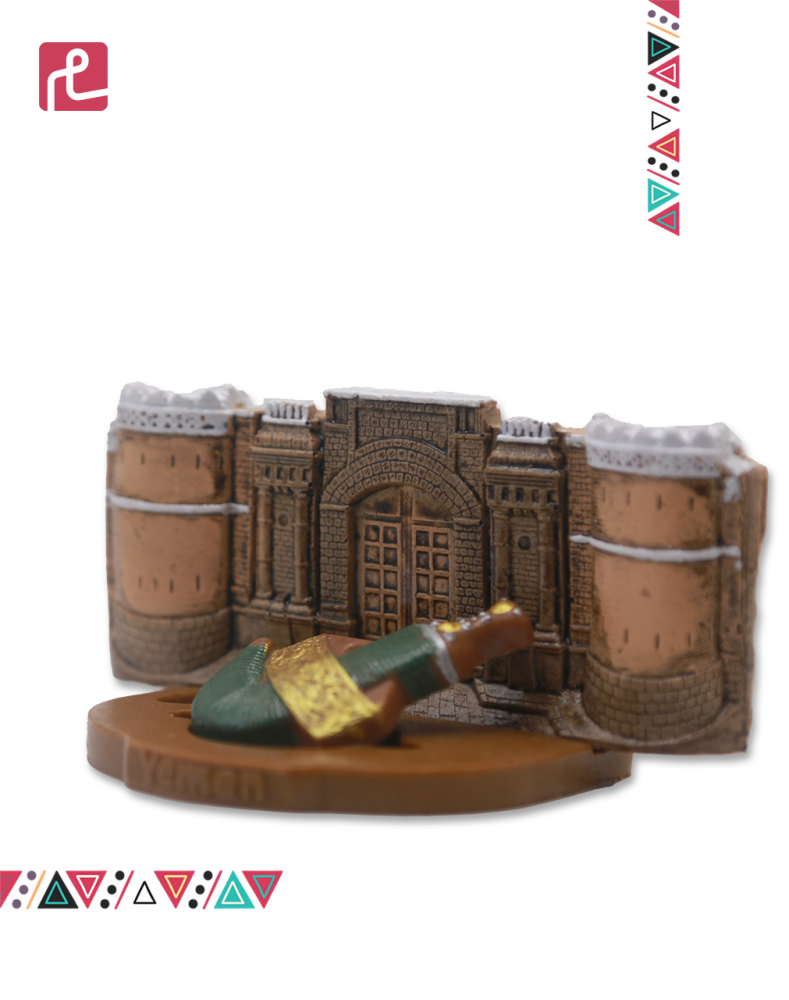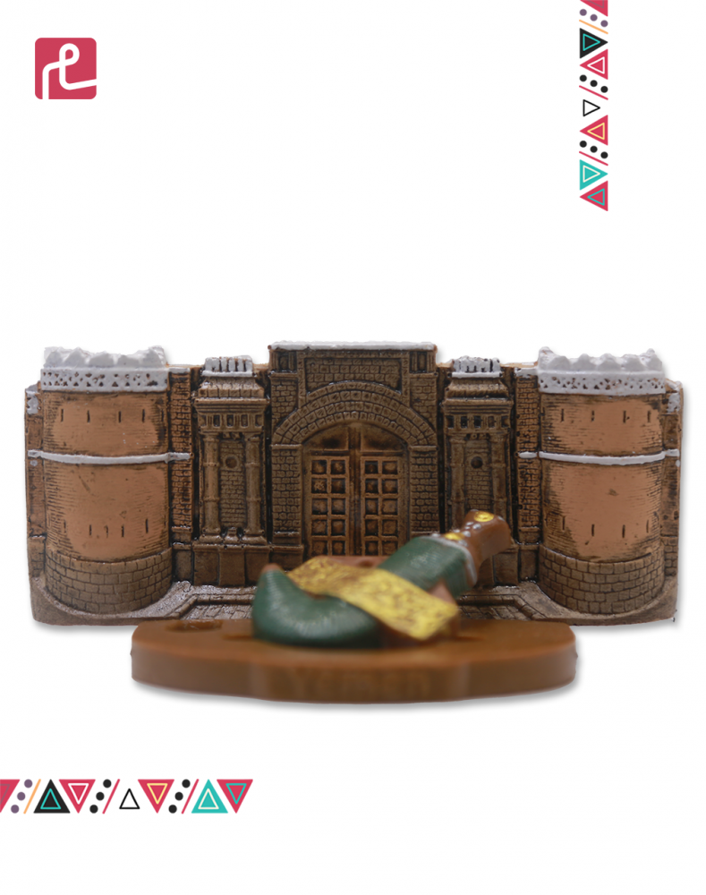 منتج فريد يصور باب اليمن التقليدي مع جنبية، مصنوع من الفيبر بلاستيك بجودة عالية، يضيف لمسة من الأصالة والجمال إلى أي مكان يتم عرضها فيه.