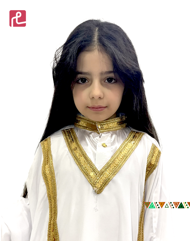 ثوب تراثي راقي مستوحى من الزبون الحجازي للأطفال، يتميز بلونه الأبيض النقي وتطريزاته الذهبية الفاخرة التي تزين الحواف بأناقة. التصميم يعكس الفخامة والبساطة في آنٍ واحد، مع لمسات تقليدية تبرز جمال التراث الحجازي.